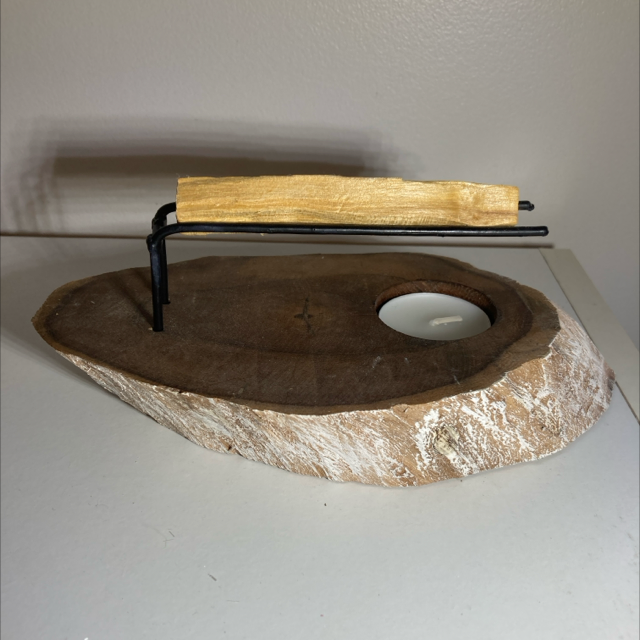 Light the tea light and place in the burner, place one palo santo stick on top of the metal arm and enjoy the earthy woody scent of palo santo to cleanse and relax