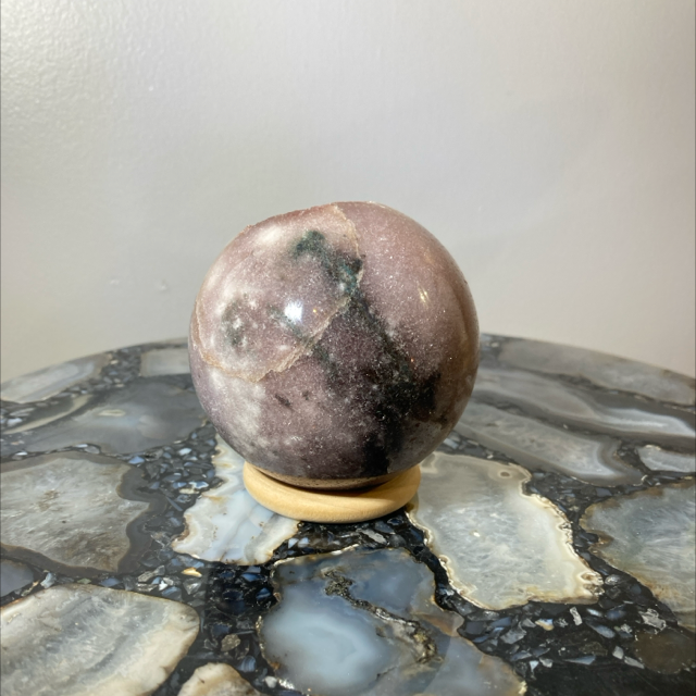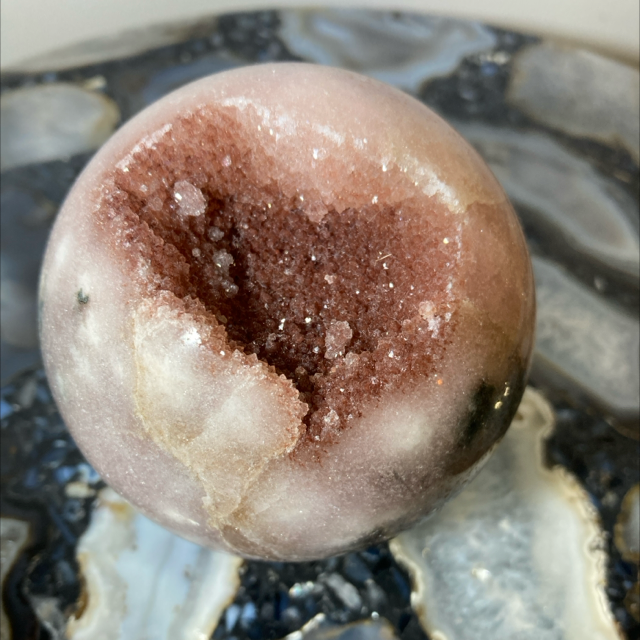 Pink Amethyst druzy sphere with green jasper. A lovely sparkle to this sphere